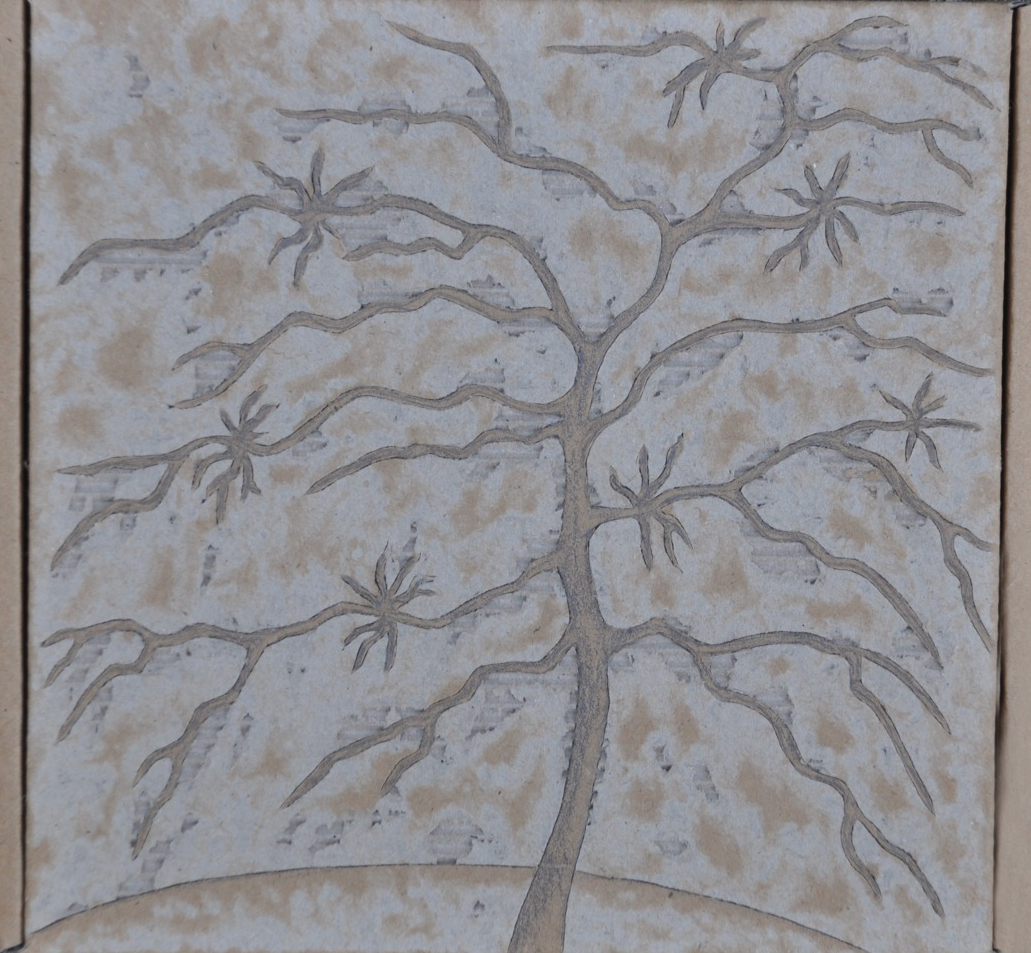 De kartonribbels ondersteunen veelal de afgebeelde voorstelling, waarbij in dit geval de boom tot zijn oervorm is teruggebracht. Jan Reinder Adema had eerder o.a. solo – exposities in het Grafisch museum te Groningen en Joure. Werk van hem is opgenomen in o.a. de collectie van de Friesland bank, gemeentelijke instellingen en particulieren.